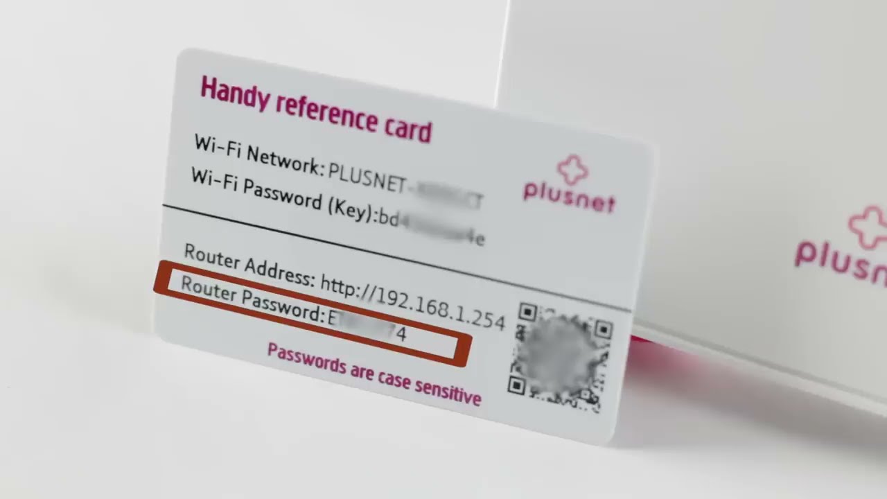 Your WiFi network name starts with Plusnet and has a few letters and numbers at the end, just like this: PlusnetA1B2C3. Your password's ten characters long with letters and numbers. You'll find them both on the back of your router and on the reference card that came with it.
